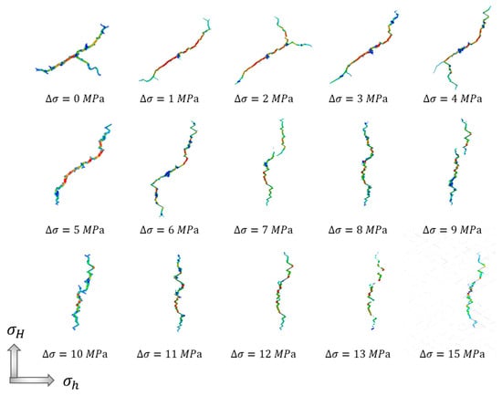 The simulation results are presented in Figure 8, Figure 9, Figure 10, Figure 11 and Figure 12, which indicate that the in situ horizontal stress difference played a critical role in the propagation of hydrofractures in a natural fracture network. Figure 8 shows the extracted hydraulic fractures’ morphology under different in situ stress differences. It is observed that under a small in situ stress difference, the induced fracture propagated at an angle with the horizontal stress direction and developed secondary fractures. With the increase in in situ stress differences, the angle of the induced fracture with maximum in situ horizontal stress became smaller, and no more secondary fractures occurred.