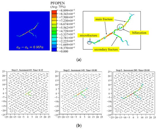 Figure 9. The in situ stress difference at 0 MPa. (a) Schematic diagram of the fracture morphology. (b) The propagation process of the hydrofractures in a natural fracture network.