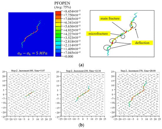 Figure 10. The in situ stress difference at 5 MPa. (a) Schematic diagram of the fracture morphology. (b) The propagation process of the hydrofractures in a natural fracture network.