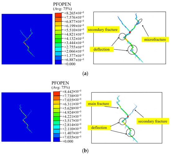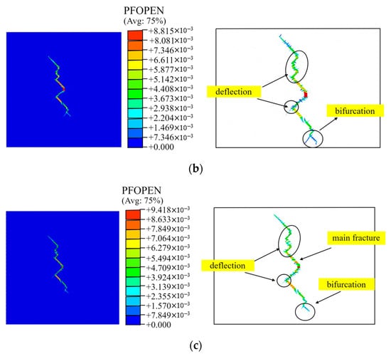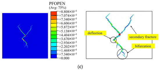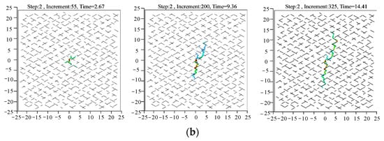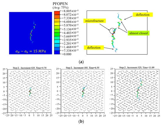 To figure out the mechanism of fracture propagation in a natural fracture network, we extracted the coordinates of natural cracks and hydraulic fractures at different times, as depicted in Figure 9b. The 0 MPa in situ stress difference means that there was no preferential direction. As weak planes in the rock, the location of natural fractures might observably attract the hydrofracture. Thus, the induced fracture propagated along the nearest right-sloping natural fractures after it initiated, since they were closer than the left-sloping ones. Thereafter, the fracture tip continuously captured the nearest weak plane to extend. At the intersection of natural fractures in different directions, the two natural fractures may be reactivated simultaneously, where fracturing fluid distributed and lead to bifurcation and secondary fracture.