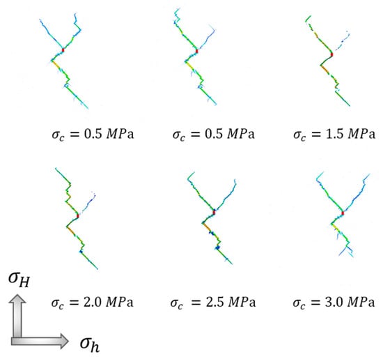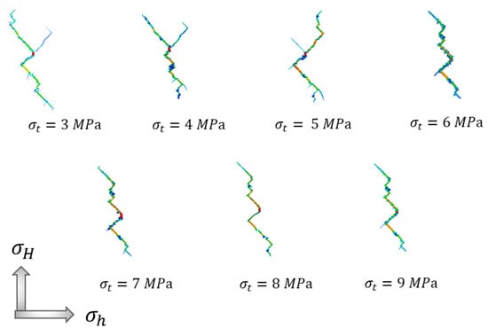 Figure 13 shows the extracted hydraulic fractures’ morphology under different rock tensile strengths. It indicates that the bifurcations and secondary fractures were diminished when the rock tensile strength was higher. To understand the propagation pattern of the hydraulic fractures, we analyzed the step-by-step fracture development when the rock tensile strength was 3 MPa, 6 MPa, and 9 MPa, as shown in Figure 14. When the tensile strength was 3 MPa, hydraulic fracturing produced a long left-sloping main fracture and a right-sloping secondary fracture. The secondary fracture propagated for a short distance and stopped. When the tensile strength of the rock was 6 MPa and 9 MPa, only the main fracture occurred, and the main fracture propagated in a zigzag fashion in the natural fracture network and rock matrix. The smaller the differences between the tensile strength of the rock and the natural fractures, the greater the possibility of hydraulic fracture propagated along the natural fractures. It can be seen from Figure 13 that when the tensile strength of rock was relatively small, the phenomenon of fracture bifurcation was more obvious, forming a secondary fracture and more bifurcations. This is because when the tensile strength of rock was higher, greater resistance was needed to overcome it to break up the rock, and fewer bifurcations occur, with a smaller fissured area.