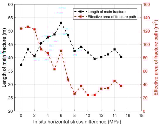 The main fracture length and the effective area of a fracture path under different in situ stresses are summarized in Table 3 and Figure 17. With the increase in horizontal in situ stress difference, the length of the main fracture first increased and then declined. The maximum occurred when the horizontal in situ stress difference was 6 MPa, where the in situ stress ratio was 1.12, and the longest main fracture was 53.1 m. This indicates that an excessive horizontal in situ stress difference will lead to a single shape and direction of a hydraulic fracture, which is not conducive to the complexity of a fracture network. In general, the effective area of the fracture path decreased with the increase in the horizontal in situ stress difference. Its value was higher when the horizontal in situ stress difference was at a low level (0~2 MPa). This may be attributed to the secondary fracture with a large angle to the direction of the main fracture. The result shows that the key to increasing the complexity of the hydraulic fracture network is to form secondary fractures with a larger angle to the main fracture to enlarge the network morphology.