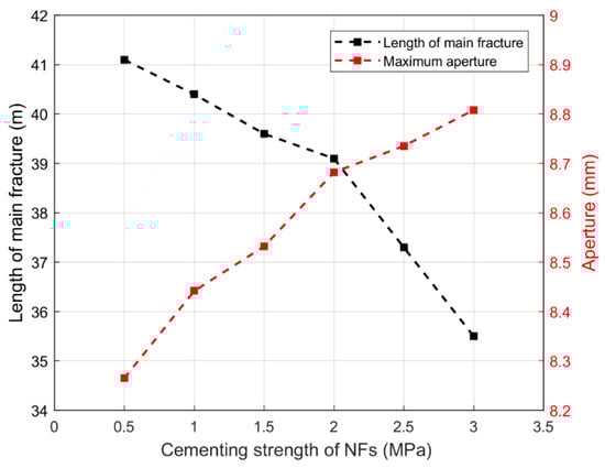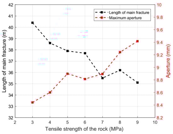Figure 18 and Figure 19 show the length of the main fracture and maximum aperture under different tensile strengths of rock and cementing strengths of natural fractures, respectively. The fracture parameters are listed in Table 4. It can be seen that with the increase in rock tensile strength, the length of the main fracture decreased, in general. When the tensile strength of rock increased from 3 to 9 MPa, the length of the main fracture decreased from 40.4 to 35.1 m. This is because fracturing rock needs more energy when the tensile strength is higher, and it is difficult for a fracture to propagate in rock. Thus, excessive rock tensile strength is not conducive to stimulation treatments. It is better to select reservoirs with appropriate rock tensile strength for fracturing operations when conducting a fracturing feasibility study, for better economic benefits. In addition, it was found that the maximum aperture of the hydraulic fracture increased as the length of the crack decreased. This may because a longer length results in additional leak-off and reduces the fluid pressure in fractures [15], which makes the fracture more narrow.