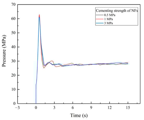 Figure 22. The bottom hole pressure under different cementing strengths of natural fractures.