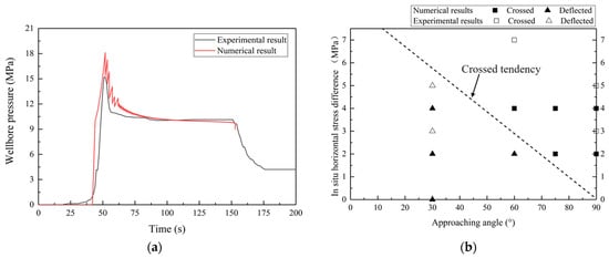Another model was used to verify the accuracy of the interaction between hydraulic fractures and natural fractures. Different scenarios might occur in the interaction of a hydraulic fracture and a pre-existing natural fracture in naturally fractured shale reservoirs [23,51,52]. The hydraulic fracture may deflect into the natural fracture under the influence of the pre-existing fracture, or it may cross directly without being impacted by the natural fracture. The numerical model was built to simulate the intersection behavior of a hydraulic fracture and a single pre-existing natural fracture. A cohesive pore pressure element was inserted into the model to serve as the natural fracture, and coupled pore fluid diffusion and stress analysis were used to simulate the solid–fluid problem. By changing the in situ horizontal stress difference and the approximation angle, different propagation behaviors of hydraulic fractures were obtained. The numerical results and the experimental results are shown in Figure 24b. Square data denote that the hydraulic fracture crossed the natural fracture, while triangle data denote that the hydraulic fracture was captured and deflected to the direction of the natural fracture. At a small approaching angle, the experimental results and the simulation results showed that hydraulic fractures were deflected. When the approaching angle was 60°, the numerical results showed that the hydraulic fracture deflected under 2 MPa in situ stress difference and crossed under 4 MPa in situ stress difference. At higher approaching angles, the numerical results agreed with the experimental results that the hydraulic fractures crossed the natural fracture. In general, the simulation cases were consistent with the experimental cases in the literature [53]. This shows that it is effective to simulate fracture intersection behavior by using cohesive element combined with coupled pore fluid diffusion and stress analysis.
