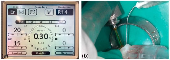 - Jezesaek, M.; Jereb, T.; Lukb, N.; Tenyi, A.; Lukb, M.; Fidler, A. Evaluation of Apical Extrusion during Novel Er:YAG Laser-Activated Irrigation Modality. Photobiomodul. Photomed. Laser Surg. 2019, 37, 544–550. [Google Scholar]