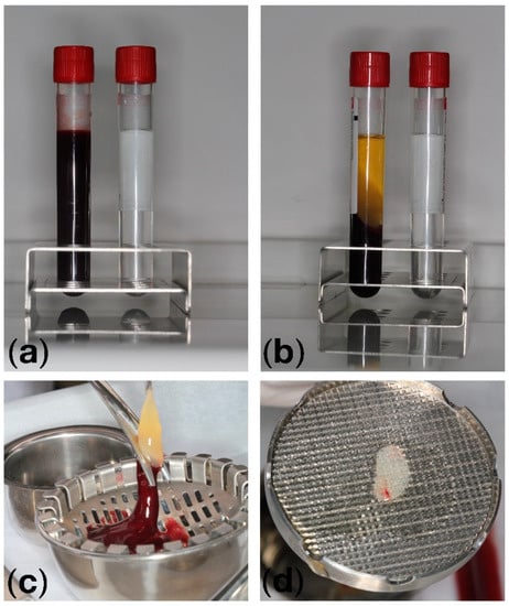 The process of preparing a CGF membrane. (a) Nine millilitre sample of whole venous blood; (b) CGF extracts close to the red blood cell layer after centrifugation; (c) the retained CGF extracts; (d) the fibrin membrane obtained from squeezing the CGF extracts.