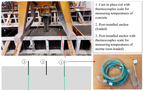 For the high-temperature tests, two thermocouple scales were installed inside each test specimen (Figure 1). The first was carried by a thin steel rod 3 mm in diameter, positioned perpendicularly to the exposed surface, to measure the temperatures of concrete at different depths along the thickness of the slab. The second was carried by a non-loaded witness anchor, which had exactly the same characteristics as the loaded anchor. The only difference is that for the witness anchor, the hole drilled in the concrete crosses the entire thickness of the slab to bring out the thermocouples through the unexposed face. It measured the temperatures at the concrete–steel interface, i.e., the temperatures of the adhesive mortar along the embedment depth. The positions of the thermocouples were chosen with respect to two fundamental conditions: they did not have to intercept the theoretical concrete cone, and they had to be far enough from the specimen edges to avoid any possible edge effects on the temperature distribution.