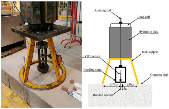 The ambient temperature tests were performed following the standard unconfined tension test setup for technical approvals, specified in TR 048 [30]. The loading setup consisted of a displacement-controlled system, which allowed capturing the post-peak behavior of the anchor. A hydraulic jack transferred the load to the anchor through a high-strength steel rod, which was connected to a hollow cylinder cage, itself connected to the free end of the anchor by two coupling nuts. To prevent the vertical movement of the slab, the jack was supported by a steel ring, which rested directly on the slab. The dimension of the support was chosen sufficiently large, i.e., the diameter was larger than 4×hef to allow the formation of an unrestricted cone. The applied load was measured by a load cell placed on the top of the load cylinder. For measuring the anchor displacement, a linear variable differential transformer (LVDT) was installed on the top of the anchor in such a way that its axis and that of the anchor coincided.