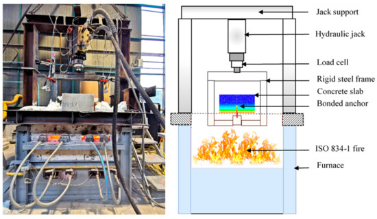 The tested anchors consisted of carbon steel threaded rods installed in the hardened concrete slabs 36 days after their pouring. The bonding material consisted of an inorganic adhesive mortar, for which the installation procedure and curing time were specified by the manufacturer. The bond resistance of the adhesive mortar at ambient temperature was also determined experimentally according to the relevant approval test procedure [30], in the same concrete batch and with the same embedment depths, on the basis of three tests per embedment depth. The characteristics and mechanical properties at ambient temperature of the different materials constituting the anchoring system are listed in Table 2.