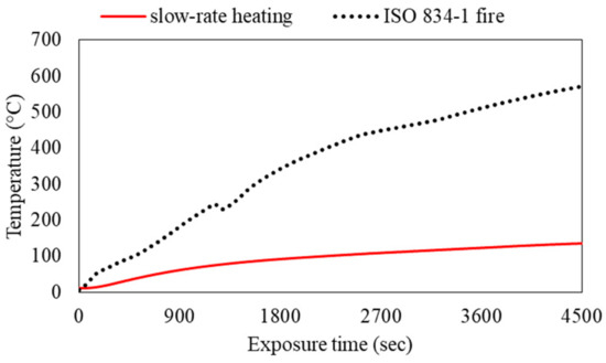 From the beginning of the heating, the thermocouples placed in the concrete and in the mortar recorded the temperatures at their positions. For comparison between the two heating scenarios, Figure 4 shows the typical evolution of the temperature of concrete measured by the thermocouples closest to the exposed surface, at a depth of 10 mm, for tests 75-1 (slow-rate heating) and T125-ISO-3 (ISO 834-1 fire conditions).
