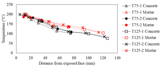 The temperatures reached at different depths in concrete and in the mortar at the end of the slow-rate heating are presented in Figure 5. It is observed that at the same distance from the exposed surface, the temperature of the mortar was in general slightly higher than the temperature of concrete, but the thermal gradient was more pronounced in concrete. In concrete, the temperature at the exposed surface was about 225 °C, and the temperature at embedment depth was around 100 °C for 75 mm anchors and around 80 °C for 125 mm anchors. During the heating, the vapor flowed out freely through the non-exposed faces, and a through-thickness hole was made to bring out the thermocouples attached to the non-loaded witness anchor.