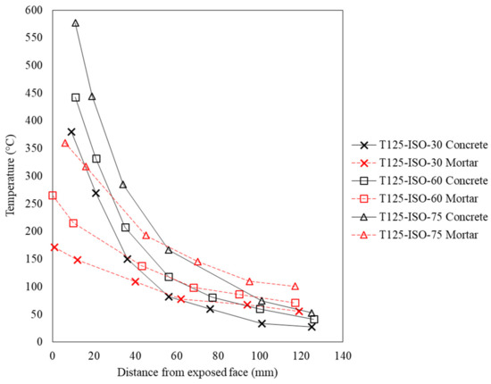 Thermal profiles in concrete and mortar with ISO 834-1 fire conditions.