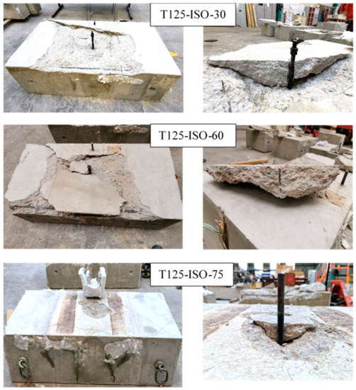In the tests conducted with ISO 834-1 fire conditions, the crack patterns are shown in Figure 9. A clear concrete cone failure was obtained in the tests T125-ISO-30 and T125-ISO-60, whereas for T125-ISO-75, the crack pattern showed a combined failure, with a cone part over 60 mm of the depth and a debonding at the concrete–mortar interface over the remaining depth. It can be seen that in the case of clear concrete cone failure, the concrete cover was removed, leading to direct exposure of the rebar, which is particularly dangerous for a structure. It is also interesting to observe that T125-ISO-1 and T125-ISO-2 switched from a combined failure at ambient temperature to a pure concrete cone failure at high temperature. Knowing that at high temperature for those two anchors, the temperature of concrete near the embedded end was under 50 °C and did not exceed 100 °C at the mid-depth, one possible explanation for this change in failure mode is thus the contribution of the concrete near the exposed face, which was at considerably different temperatures under ambient conditions and under ISO 834-1 fire conditions.