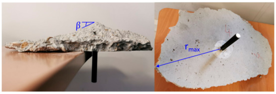 For the three test conditions, the slope of the concrete cone in the case of pure concrete cone failure varied around the circumference and along the crack path. The slope flattened when the crack reached the surface of the slab, as is particularly apparent in Figure 7 for ambient temperature, with T75-2 (Figure 8) and with T125-ISO-2 (Figure 9) for high temperature. Likewise, the horizontal extent of the cone at the surface was also variable. The minimum and maximum values of the failure angle β measured without considering the flattening part of the crack trajectory are presented in Table 3 for each test, together with the maximum radius rmax of the concrete cone measured at the surface. Those parameters are illustrated in Figure 10.