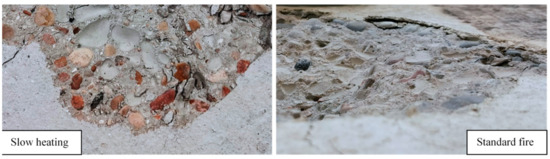 Apart from the geometrical aspects, it was also observed in the high-temperature tests that near the exposed surface, the aggregates particles, which are limestone based, experienced the typical chemical discoloration of limestone [31] at the different ranges of temperature reached. While their natural color was light ochre yellow at ambient temperature, they turned reddish-brown in tests with slow-rate heating (250 °C–300 °C) and gray in tests with ISO 834-1 fire (600 °C–800 °C) (Figure 11).