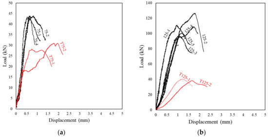 Load–displacement curves for: (a) hef = 75 mm and (b) hef = 125 mm.