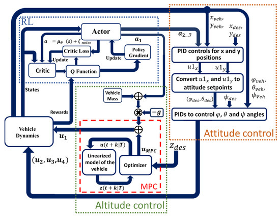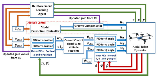 The altitude controller and the attitude controller are the two main parts of the control architecture. The altitude controller, as shown in Figure 2, maintains the altitude of the aerial robot at the required level. In most commercial aerial robots, the altitude controller is a PID controller with fixed control gain values. In this research, a proposed control architecture consisting of a MPC controller and a gravity compensator is proposed as a replacement for conventional PID controllers. The scaling factor of the compensator is adaptively adjusted during the operation of the robot, using actions generated by the reinforcement learning agent. The robot attitude controller is the second major controlling component of the system. The controller is made up of two distinct PID controller blocks. The difference between the desired x and y position and the actual x and y location in space is measured and defined as the position error in 2D. The x-position and y-position PID controllers in the outer loop were designed to minimize the error. The control commands of the position controllers are transformed to appropriate roll and pitch setpoints. The inner loop PID controllers use the resulting roll and pitch setpoints as reference inputs. The control gain values of the inner loop PID controllers are constant in our proposed control architecture, whereas the control gain values of the outer loop PID controllers are adaptively adjusted using trained policy from the RL-based adaptation algorithm.
