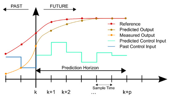 In Equation (35), is a () weight matrix ( is the number of plant output variables). Here, and () are positive-semi-definite weight matrices ( represents the number of manipulated variables). In the aforementioned cost function, p is the prediction horizon, which can be adjusted according to the controller performance and the processing power of the hardware. In Equation (35),, , and can be computed, using Equations (36)–(38).