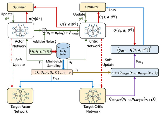 Figure 4 depicts the aforementioned learning process in the DDPG algorithm. The architecture is comprised of two actor-critic networks. The target networks in the architecture stabilized the learning procedure. The noise improves the exploration of the reachable control states. The proposed RL-based control algorithm (Algorithm 1) is described in the following pseudocode.