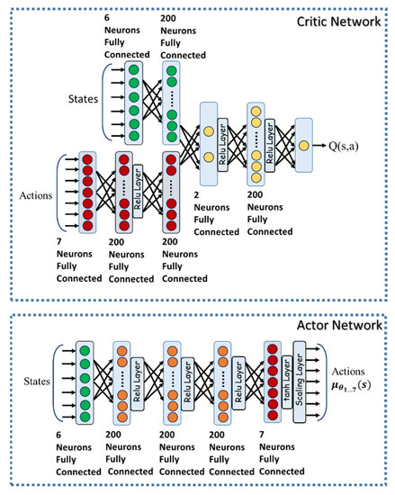 To find the optimal architecture for the actor-critic network, many simulations were run with different numbers of layers and neuron counts in neural networks. According to the simulations findings, it was observed that increasing the size of hidden layers encourages polynomial exploration, whereas increasing the number of layers promotes exponential exploration. The number of layers in the actor network varied from 1 to 5 for the purpose of the experiment. Increasing the size of the actor network layers to a value of more than 400 neurons per layer resulted in over-parameterization and oscillation of the discounted long-term reward. Over-reducing the number of layers, on the other hand, resulted in poor performance. According to the simulation results, it was concluded that at least 130 neurons in each layer of the actor and the critic are necessary to learn the policy effectively, with 200 being the ideal number. The architecture of the designed actor and critic neural networks is shown in Figure 6.