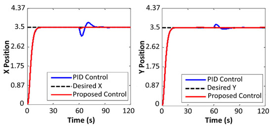 During the aerial robot operation, the trained policy actively estimated the parameters of the controllers. The first experiment was done in two stages (the first time with the proposed controller and the second time with conventional PID controllers) to compare the performance of the proposed controller with that of the conventional PID controller. During the experiments, some weight disturbances (random values between 0% and 70% of the mass of the robot) perturbed the system. The first defined maneuver for the aerial robot was to get to the coordinates (x, y, z = 3.5, 3.5, 4) and stabilize its position in space. Figure 8, Figure 9 and Figure 10 show the performance of the PID controller and the proposed controller.