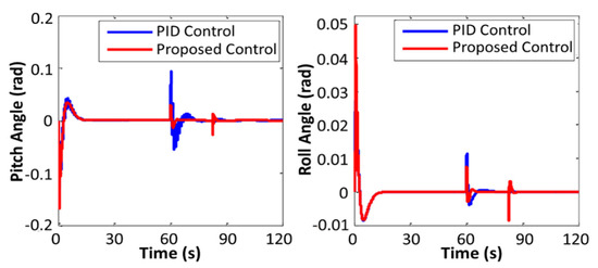As indicated in Equations (30)–(32), three PID controllers were implemented in the inner loop PID control block to provide manipulated variables for robot attitude control.