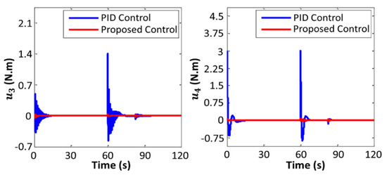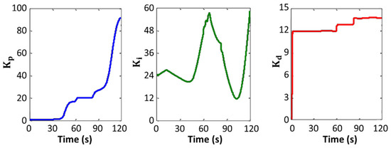 Variations in the values of the manipulated variables are plotted in Figure 11 and Figure 12. Figure 13 and Figure 14 exhibit changes in control gain values that occurred during the operation of the robot.