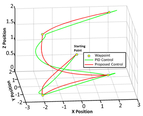As mentioned in Section 3, a dynamics model of a commercial aerial robot (Parrot) was selected and implemented in the simulator environment as an aerial robot under control to test the effectiveness of the proposed control architecture in controlling an aerial robot. The AR Drone 2.0, the Rolling Spider, and Mambo are all Parrot products that can be programmed using MATLAB [51]. The AR Drone 2.0 toolbox was developed and distributed by researchers. In addition, a MATLAB Simulink Support Package for Rolling Spider is available as an add-on development package based on MIT’s Aerospace Blockset supporting simulation, hardware code generation, and interface for Parrot Minidrones [52]. The Parrot Mambo (6-DOF small quadcopter) comes with ultrasonic, accelerometer, gyroscope, air pressure, and down-facing camera sensors. It allows algorithms to be applied to the robot via a Bluetooth link over a Personal Area Network (PAN).The Simulink Support Package for Parrot Minidrones [53], which is developed using the UAV toolbox from Mathworks [54], was utilized in this research study to simulate the quadrotor. The aerodynamics effect was deemed minor for the purpose of simplicity, hence the block associated with the aerodynamics effect was deactivated throughout the simulations. Furthermore, during the simulations, parameters of the environment (such as air pressure at various elevations) were also assumed to be constant. A UAV waypoint follower block (included in the UAV toolbox) was employed to generate several successive waypoints. In the Simulink environment, two experiments were carried out to evaluate the performance of the proposed control architecture, compared to that of typical PID controllers.