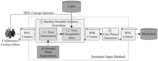 Then, the machine-readable contract generation will convert the HNL contract into an HML contract. Specifically, the HNL contract is first tokenized clause-by-clause. With AI-assisted WSD, a clause is automatically split into a collection of tokens called terms, the sense is predicted by the AI model from potential sense. Then, by referring to the CoDic, the terms are converted into concepts, whose definitions follow the specifications in [45,48]. Notably, the automatic generation output of the AI-assisted generation process is only the prediction of HNL–HML conversion, which the contracting parties can examine and adjust so that the semantic consistency between the HNL and HML contract is maintained.