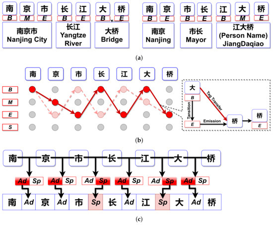 Segmentation is particularly for languages that lack explicit boundaries between characters, such as Chinese, Japanese, and Korean. Current dominant algorithms considered word segmentation as the sequence-labeling task. Maximum Entropy (ME) models [27] and Conditional Random Fields (CRF) [28,29] models were leveraged as the tagger. Various tagging schemas were explored, such as BMES [30] (Begin, Middle, End, Single), BIES (Begin, Inside, End, Single) [31], SEP-APP (Separate, Append) [32], and SC (Separation, Combination) [33]. Despite the notations varying in different tagging schemas, the goal of describing each atomic unit’s position in a word segment is similar. Moreover, rich features were exploited for achieving more accurate segmentation results. Word features [34] and bigram features [29,32,35,36,37] were well-perceived to be two of the most common and effective features. Besides the bigram and word features mentioned above, language-specific features were utilized [38] to obtain accurate segmentation results. Moreover, the extra information was leveraged through the semi-supervised models to achieve better segmentation results [37,38,39,40]. With the development of versatile pre-trained models, such as BERT [41], the performance of the WS task is boosted and the cost of feature engineering is significantly reduced. Based on powerful feature representations, more WS algorithms were proposed [42,43] that focused on improving the structure of the network.