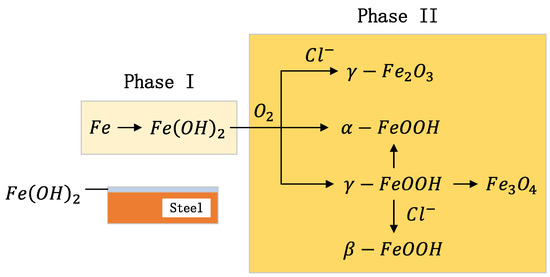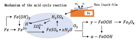 Ningbo is an important industrial port city in the southeast of China, with dual environmental characteristics of strong corrosion and strong typhoons. Its industrial–marine atmospheric environment will accelerate the corrosion of the galvanized layer on the surface of local steel structures, which, in turn, can lead to steel corrosion. According to the current national standard, “Corrosivity Classification of Atmospheric Environment” [1], the atmospheric environment is mainly divided into an urban atmosphere, rural atmosphere, marine atmosphere and industrial atmosphere. Among them, the marine atmosphere and industrial atmosphere are typical corrosive atmospheric environments. In the marine atmosphere (the corrosion mechanism is shown in Figure 1), the high concentration of chloride ions is the main factor causing the corrosion of carbon steel, dissolved in the liquid film of chloride ions and greatly enhancing the conductivity of the liquid film solution, thus intensifying the polarization reaction and making the corrosion rate increase [2]. In the industrial atmosphere (the corrosion mechanism is shown in Figure 2), sulfur dioxide and other corrosive gases are the main factors causing the corrosion of carbon steel; these acidic gases dissolved in the liquid film makes the pH value of the solution lower, thereby increasing the corrosion of carbon steel [3]. There are more and more large-span transmission projects with high towers and complex structures along China’s eastern coast, which are inconvenient for detecting corrosion during the service life and cause difficulties in repair and replacement. Steel corrosion not only reduces the cross-sectional area of steel members but also decreases the remaining mechanical properties of steel. Therefore, the accurate prediction of the carbon steel corrosion depth becomes an important prerequisite for the performance assessment of corroded transmission towers in service.