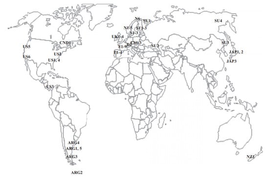 In this paper, carbon steel corrosion data from different atmospheric exposure tests worldwide were used as samples. The data sets were obtained from the ISO-CORRAG program [26] and China Gateway to Corrosion and Protection (http://www.ecorr.org/, accessed on 1 July 2021), including the latitude and longitude of the exposure site, the corrosion depth of the carbon steel and the corresponding natural exposure time. According to the different geographical locations of the exposure sites (as shown in Figure 3), the atmospheric environments were divided into a marine atmosphere (M), industrial atmosphere (I), urban atmosphere (U), rural atmosphere (R), urban–marine atmosphere (U–M) and industrial–marine atmosphere (I–M). Exposure tests to the carbon steel atmosphere at some of the sites are shown in Figure 4. The exposure test protocols were designed in strict compliance with “ISO 9226:2012, Corrosion of Metals and Alloys” [26].