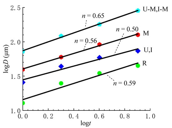 The corrosion depth D (μm) was used to represent the corrosion loss of steel. Scholars have proposed various time-varying models for corrosion, mainly including linear, power, logarithmic, exponential, nonlinear–linear and bimodal models [3]. However, according to the results of the long-term exposure tests, it was found that the corrosion loss of metals under different atmospheric environments basically follows the power–linear function law [27]: In the first stage, the metal corrosion loss shows a power function growth law; in the second stage, the corrosion loss grows linearly, i.e., it shows a stable development trend. The expressions are as follows: