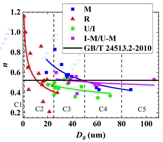Considering the correlation between n values on the corrosiveness of the atmospheric environment, double logarithmic fits were performed according to the test data of each exposure site to obtain the n values and the corresponding D0 values. Figure 5 shows a double logarithmic plot of the corrosion depth vs. exposure time for carbon steel at some typical sites—specifically, marine (M) atmosphere for Tokyo, rural (R) atmosphere for Ahtari, urban (U) and industrial (I) atmospheres for Otaniemi and urban–marine (U–M) and industrial–marine (I–M) atmospheres for Ponteau Martigues. It can be seen that the corrosion rate of carbon steel is the fastest, and the first-year corrosion depth D0 is also the largest for the exposure site in the urban–marine and industrial marine atmospheres. The first-year corrosion depth of carbon steel at the exposure site in the rural atmosphere is the smallest. The corresponding n and D0 values under each exposure site are shown in Figure 6. According to the specification GB/T19292.1-2018 [28] on the division of corrosion grade regions, the D0 values under each exposure site in Figure 6 can be classified to the C1, C2, C3, C4 and C5 regions. It can be seen that the corrosion grade of carbon steel under the rural atmosphere was mainly concentrated in the C2 region, while the corrosion grades of carbon steel under the marine, urban/industrial and industrial–marine/urban-marine atmospheric environments were mainly concentrated in the C3 and C4 regions. In particular, the corrosion grades of carbon steel under the marine atmospheric environment, industrial–marine/urban–marine atmospheric environment at individual sites reached the C5 region. Overall, the n value and the D0 value shows a power function change law—that is, as the D0 value increases, the n value shows an obvious downward trend, the specific fitting function as shown in Equation (2), which is quite different from the specification of GB/T 24513.2-2010 [29], which provides a unified n value under all atmospheric environments, indicating that this method of determining the n value is more accurate.