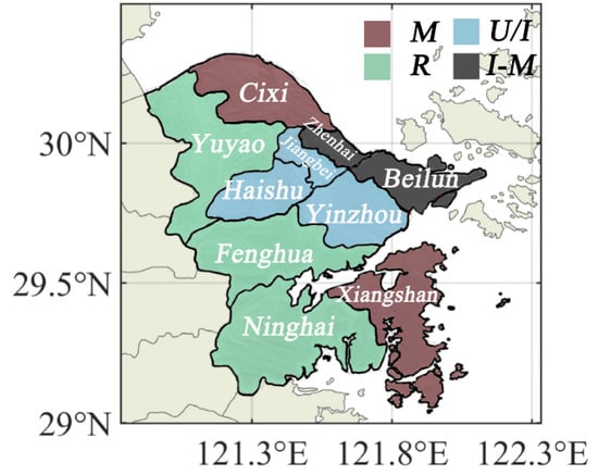 Figure 7 shows the division of the atmospheric environment in each district and county of Ningbo. The Zhenhai District and Beilun District were classified as industrial–marine (I–M) atmospheric environments due to the heavy concentration of industry and the existence of large petroleum refineries. Cixi City and Xiangshan County are close to the sea and were classified as marine (M) atmospheric environments. Ningbo’s main urban area, Yinzhou District, Haishu District and Jiangbei District, were classified as urban/industrial (U/I) atmospheric environments. Yuyao City, Fenghua District and Ninghai County were classified as rural (R) atmospheric environments due to their proximity to the mountainous area and a weak industrial base.