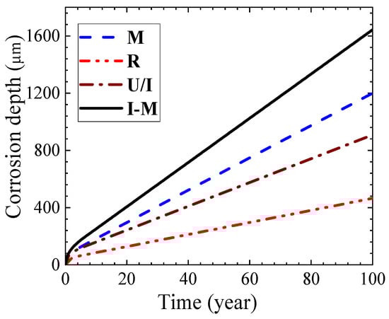 The data in Table 1 was substituted into Equation (1), and the predicted curves of the long-term corrosion depth of carbon steel in each atmospheric environment in the Ningbo area were obtained (as shown in Figure 8). It can be seen the corrosion rate from the largest to the smallest: industrial–marine (I–M) atmosphere, marine (M) atmosphere, urban/industrial (U/I) atmosphere and rural (R) atmosphere. It is worth mentioning that the corrosion depth of carbon steel exceeds 1600 μm under the 100-year corrosion age of the I–M atmospheric environment, which indicates that, in such an atmospheric environment, transmission towers are the most vulnerable to corrosion and should be focused on research.