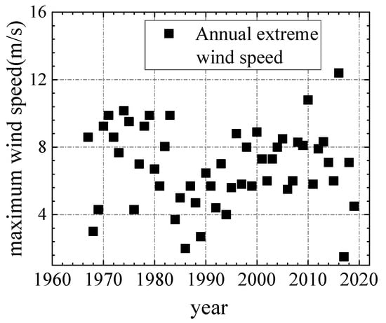 A wind climate assessment was carried out to determine the multidirectional extreme wind speed at the transmission tower site with different return periods. The Ningbo area belongs to the mixed wind climate region, which is influenced by East Asian monsoons and Northwest Pacific typhoons all year round. The daily maximum wind speed data (10-min time interval) and the corresponding wind direction records of the Ningbo ground meteorological station (58562 Yinzhou) from 1 January 1967 to 31 December 2019 were used as samples, and the data were extracted from the China Meteorological Data System (http://data.cma.cn/, accessed on 1 July 2021). According to the meteorological data specification, the collected wind speed data was carefully calibrated by adjusting the observation height, observation time interval and so on to the standard conditions. Figure 9 shows the division of 16 wind angles. D1 is the northerly wind direction, rotated clockwise every 22.5 ° as a wind direction, divided into D1, D2, …, D16. The observed daily maximum 10-min average wind speed series were categorized into 16 wind direction angles. By excluding the typhoon wind speed data, the annual maximum wind speed series of constant winds in each wind direction can be filtered. Figure 10 shows the annual maximum wind speed series of constant winds in wind direction D14.