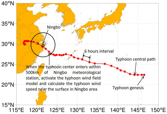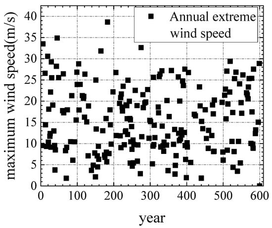 Due to the limitation of the sample size of historical typhoon wind speed observations, this paper adopted the typhoon full-track simulation and applied the Yan Meng wind field model to obtain the 600-year near-surface typhoon wind speeds affecting the Ningbo area [31]. The full-track simulation process of a single typhoon is shown in Figure 11, which can be divided into five steps, i.e., establishing the genesis, track and intensity models, calibrating the track and intensity simulation results and activating the typhoon wind field model. The Vickery empirical model [32] was used to determine the values of the key wind field parameters, such as the maximum wind speed radius Rmax and Holland pressure profile parameter B. The roughness length was taken as 0.05 m. The 600-year typhoon wind speed series obtained from the simulation was filtered and categorized according to the definition of the wind azimuth in Figure 9, and the annual maximum typhoon wind speed series under wind direction D14 is shown in Figure 12.