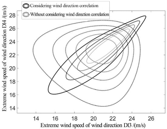 Based on the t-Copula function, the joint probability distribution models of the annual maximum wind speed series of constant wind and typhoons under 16 wind directions were constructed, respectively, and the multidirectional extreme wind speeds under different return periods were calculated by using this joint distribution model, and the specific procedures can be referred to the literature [33]. Figure 13 shows the marginal probability distribution of the annual maximum wind speed in wind direction D14. It can be seen that this wind direction is dominated by typhoons. In fact, all 16 wind directions in the Ningbo area are controlled by typhoons. In this paper, the parameters of the t-Copula function were estimated by the Maximum Likelihood Estimation (MLE). Table 2 shows the correlation coefficients of the adjacent wind directions in the correlation matrix. It can be seen that the correlation coefficients of the adjacent wind directions of the typhoons in the Ningbo area all exceed 0.7. The correlation coefficient of the adjacent wind directions between wind direction D2 and wind direction D8 even reaches 0.99, which proves that the correlation of the adjacent wind directions is very significant. The joint probability density contours of the typhoons under wind directions D13 and D14 are shown in Figure 14. It can be found that the extreme typhoon wind speeds under wind directions D13 and D14 are positively correlated under the consideration of wind direction correlation, while they do not show the correlation under the disregard of the wind direction correlation.
