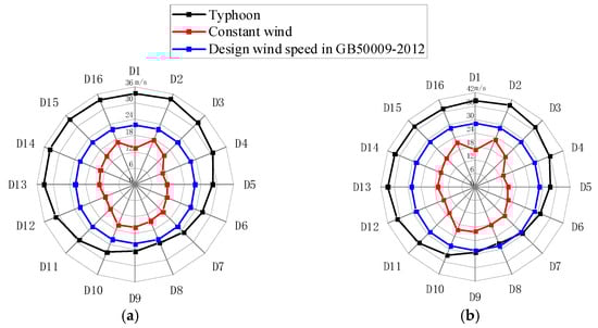 Figure 15 shows the comparison between the 10/50-year extreme wind speeds and the design wind speed given by the code in the Ningbo area. It can be found that the extreme wind speed of a typhoon is significantly greater than the extreme wind speed of a constant wind in each wind direction, indicating that the wind climate in the Ningbo area is mainly controlled by typhoons. The design wind speed given by the code is on the risky side. In addition, by comparing the extreme wind speed of each wind direction azimuth, it can be found that wind direction D2 is the most unfavorable wind direction, and its 50-year extreme wind speed value is 39.5 m/s.