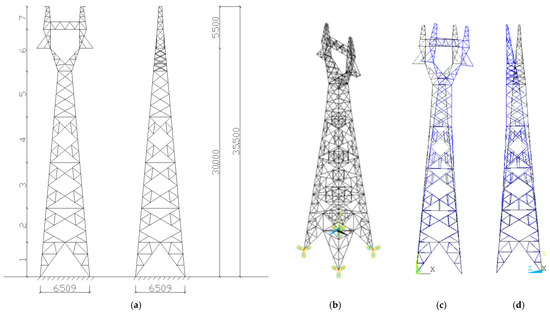 Schematic diagram of the transmission tower. (a) Single line diagram (unit: mm); (b) finite element model; (c) 1st mode f1 = 3.33 Hz; (d) 2nd mode f2 = 3.40 Hz.