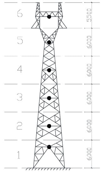 The transmission tower was divided into six simulated segments from bottom to top, and the wind blocking area of each segment was calculated separately. The wind speed at the vertical midpoint of each segment was used as the simulated wind speed of the corresponding segment, and the simulated segments were numbered in increasing order from bottom to top, i.e., segment 1 to segment 6, as shown in Figure 18. According to the wind climate assessment results, the extreme wind speed under the most unfavorable wind direction (D2) in the Ningbo area was selected as the basic wind speed, the ground roughness category was set to class B, the wind profile index was set to 0.16, the Kaimal spectrum was used to simulate the wind speed spectrum, the harmonic superposition method was used to simulate and generate the wind speed series in the downwind direction and the wind load series was generated according to the technical code: DL/T5154-2012 [34].