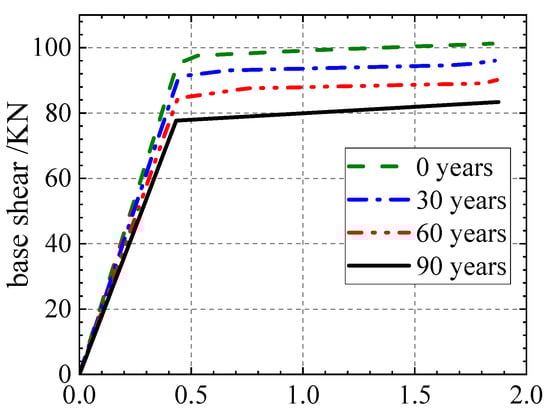 Pushover analyses were performed on the finite element models of the transmission tower with different corrosion ages, and the inverse triangular distributed lateral loading mode was used to obtain pushover curves between the base shear and the top maximum displacement, as shown in Figure 20. The maximum displacements at the top in the elastic stage for the transmission tower with corrosion ages of 0, 30, 60 and 90 years are all at 0.4 m, which is much larger than the displacement limit given by the code [34] (the code limit is 3H/1000, i.e., 0.1 m). From Figure 20, it can also be seen that the ultimate displacements of the transmission tower with different corrosion ages are all at 1.86 m. Based on the above analysis, and according to the research results related to the transmission tower damage modes and failure laws [9,10,11], three types of damage modes were defined in this paper, i.e., minor damage, moderate damage, severe damage and collapse, and the quantitative index limits for each damage mode of the corroded transmission tower were determined, as shown in Table 4.