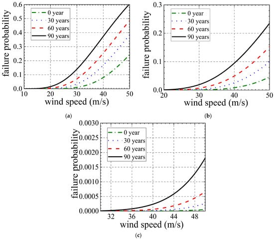 Substituting the wind load effect functions and the index limits into Equation (5), the wind-induced fragility curves of the transmission tower under an industrial–marine atmospheric environment with corrosion ages of 0, 30, 60 and 90 years can be obtained, respectively, as shown in Figure 21. It can be seen that the nominal mechanical properties of steel decrease as the corrosion age increases, leading to a significant increase in the probability of minor damage, moderate damage and severe damage of the transmission tower, and the deterioration of the wind resistance of the transmission tower by corrosion will be amplified under the effect of extreme wind damage. Under the wind loads of 50-year return periods in the most unfavorable wind direction (the corresponding typhoon wind speed is 39.5 m/s) in the Ningbo area, the tower will hardly experience severe damage and collapse, the probability of moderate damage is within 10%, and the probability of minor damage is controlled between 10% and 40%.