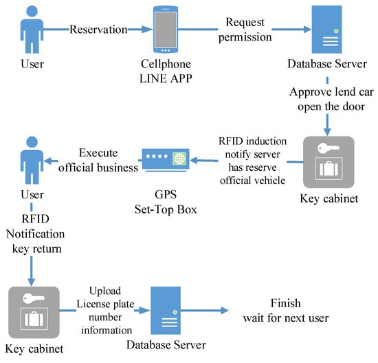 The system proposed in this study comprises four units: a set-top box, key cabinet, Line Bot, and a cloud database system (Figure 1). A user is allowed to make a reservation to use a vehicle through the Line Bot. Line Bot is used for push services in various applications such as students’ learning to save cost and enhance communication [10,11]. When the user pulls out a key and a set-top box from the key cabinet, the system activates the set-top box through radio-frequency identification (RFID) and sends the information to the cloud server. When the user returns the key and set-up box to the key cabinet, the official vehicle’s information in the set-top box is delivered to the cloud database system to let the system be in waiting mode. The detailed functions of the four units of this system are described as follows.