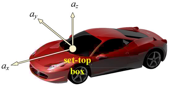 The motion of the vehicle in driving is divided into three: straight moving, stopping and turning. To obtain the exact GPS position and reduce sampling points, a 3-axis accelerometer and a gyroscope are used with GPS. As the STB is placed in front of the driver’s seat, the three-axis acceleration is defined, as shown in Figure 3.