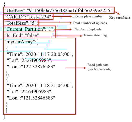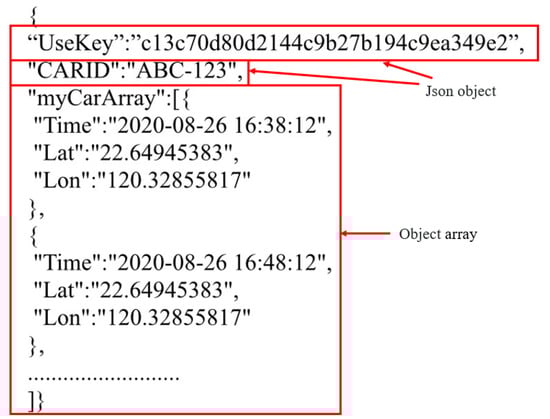 In the database reorganization of transmitted GPS data, the GPS satellite time is out of synchronization with the server time. Thus, it is impossible to distinguish each GPS datum when reorganizing the data. Given this situation, the background database generates a set of random 32-character keys when the STB operates so that each datum can be distinguished. After repeating data format improvement, the STB uploads the data in the JSON format, as shown in Figure 23. After the backend server identifies the number of each group of data and the corresponding user, the device proceeds to the next step according to the return code of the backend server.