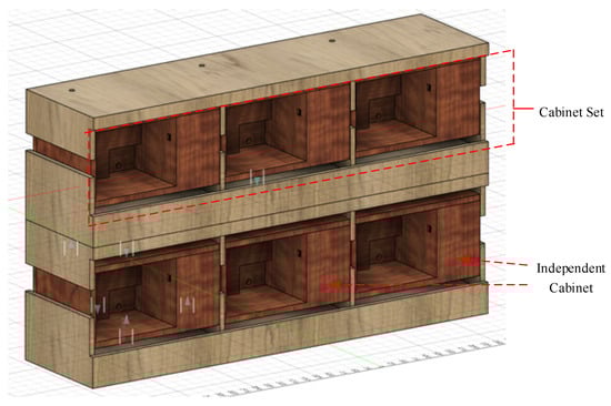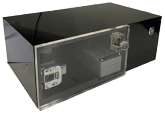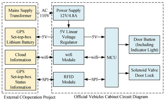 The key cabinet is composed of multiple sub-cabinets. Each sub-cabinet stores the key and STB of a vehicle (Figure 8). It has an RFID device, electromagnetic lock, charging device, and Wi-Fi communication module, which are powered by an AC/DC conversion power supply (AC110 V to DC 5.0 V). Each cabinet has an indicator light that is turned on when the key and the STB are taken away. The sub-cabinet is then in an idle mode and can be used for other keys and STBs.