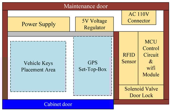 The internal layout of a sub-cabinet is shown in Figure 9. The control circuit manipulates components such as power supply, 5 V voltage regulator, 110 V main socket, RFID sensor, MCU control circuit, WiFi module, and electromagnetic valve lock. The material of the key cabinet is acryl which does not affect the RFID data and WiFi communications.